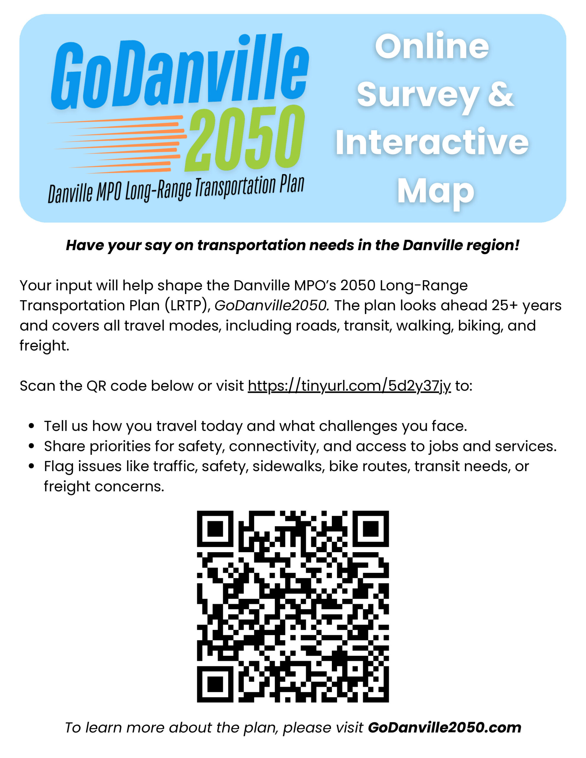 While the transportation professionals can create a plan, we need YOU to provide input so that we can develop the most effective transportation recommendations for our region. The survey should take you about 10 minutes to complete and includes two parts: several survey questions, followed by an interactive map that allows you to pinpoint where in the region you feel a transportation need or concern exists. You may access the survey by clicking here. To learn more about the effort to update the Danville MPO Long-Range Transportation Plan and to receive updates, please visit the project website at https://www.godanville2050.com/.